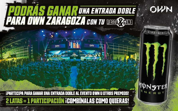 Por la compra de dos latas Monster, regalo seguro: O una entrada doble para el OWN Zaragoza para el 21 de noviembre de 2025 o pegatina con diseño de Monster