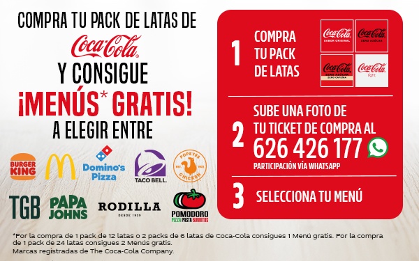 Por la compra de tu pack de latas de Coca-Cola, consigue ¡Menú gratis! a elegir entre diferentes opciones.