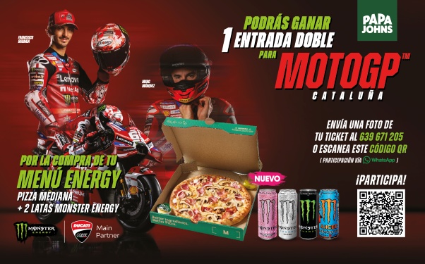 Por la compra de un MENÚ ENERGY (pizza mediana + 2 latas de Monster Energy 500ml) podrás ganar una entrada doble para MOTO GP CATALUÑA.